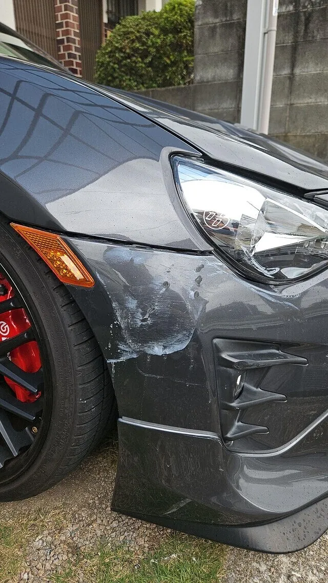 お客様のお車はフロントバンパーが外れかけている状態でした。