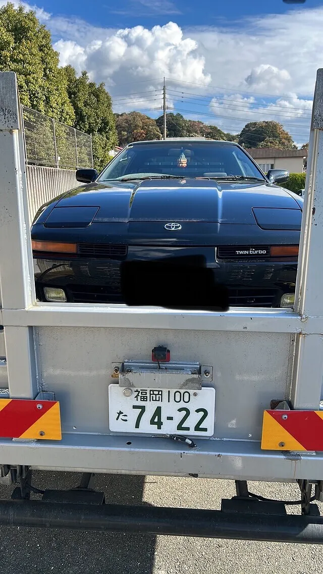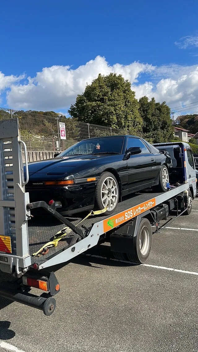 福岡県若宮市でトヨタ スープラにお乗りのお客様が、駐車中にぶつけられたとのことで、レッカー出動致しました。
